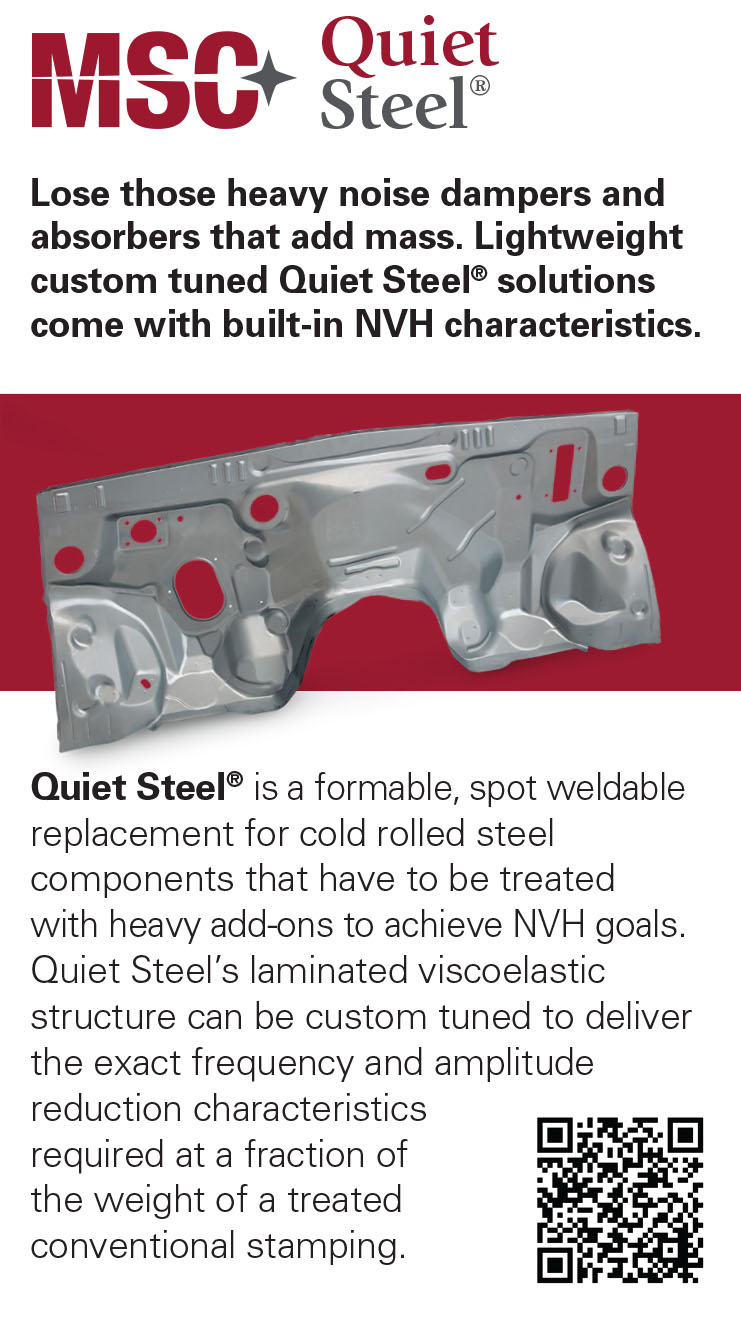 Quiet Steel is an engineered laminate that can be easily integrated into the vehicle body structure with stamped, welded, e-coated methods. Reduce sound, cost and mass with this innovative solution.